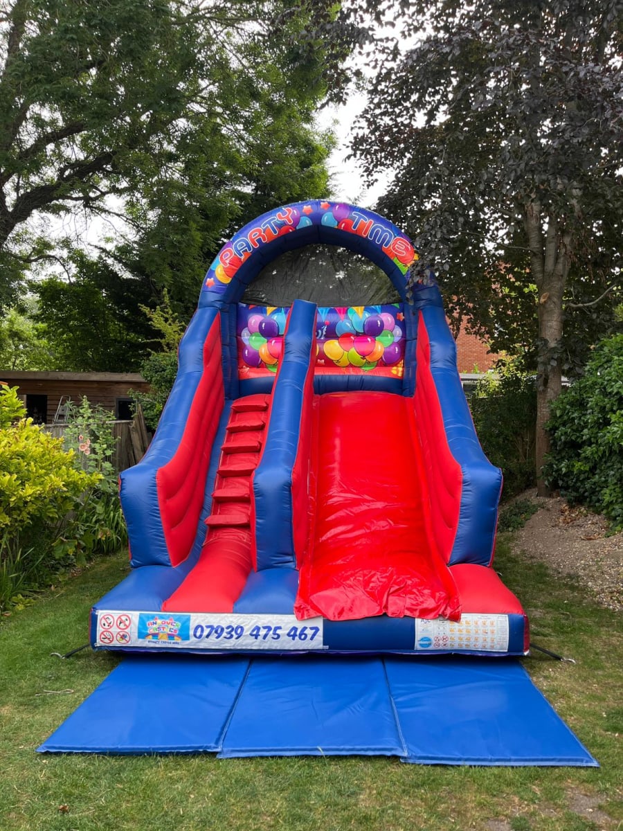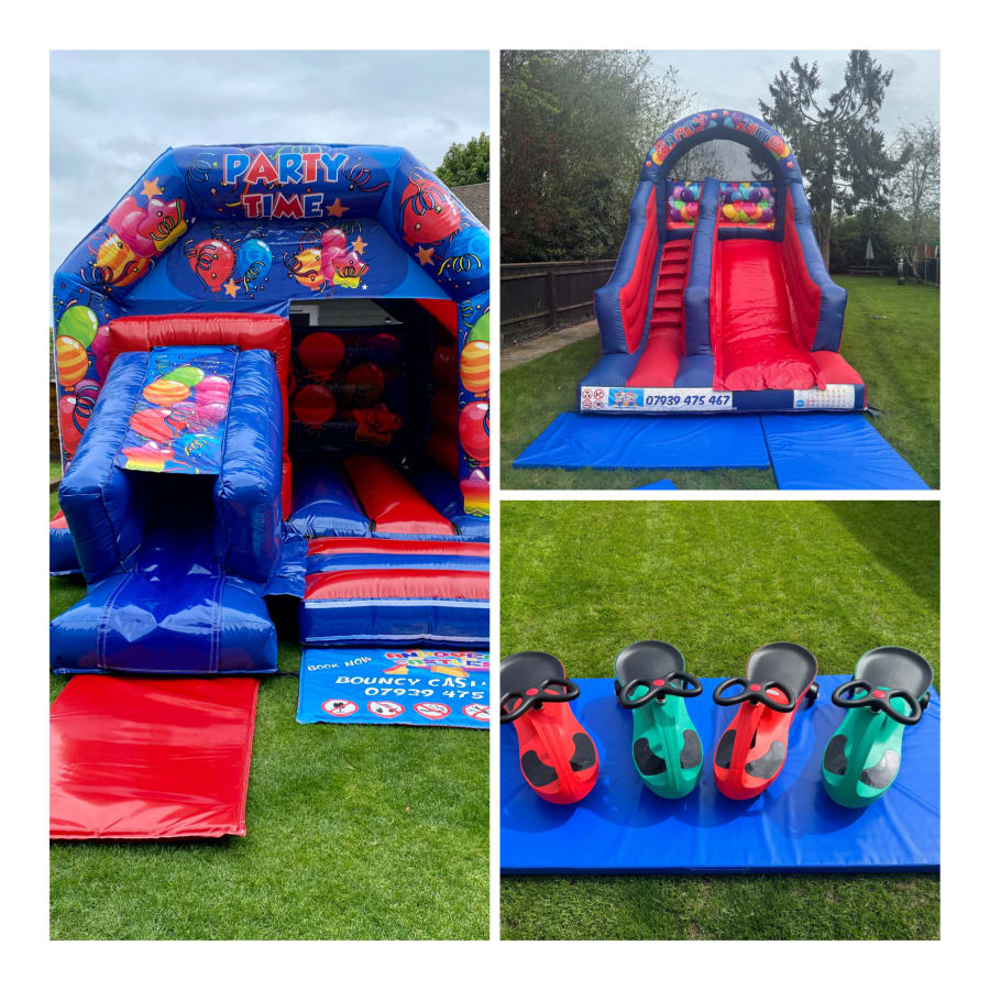 Bouncy Castle Hire Red & Blue in Andover, Test Valley, Hampshire, Wiltshire, Berkshire is the perfect party bundle for community events, birthdays, and school fetes. Our team delivers a vibrant red and blue bouncy castle with your choice of a side slide or front slide, plus an action-packed giant slide and a fleet of didi cars for youngsters to race around safely. 🎉