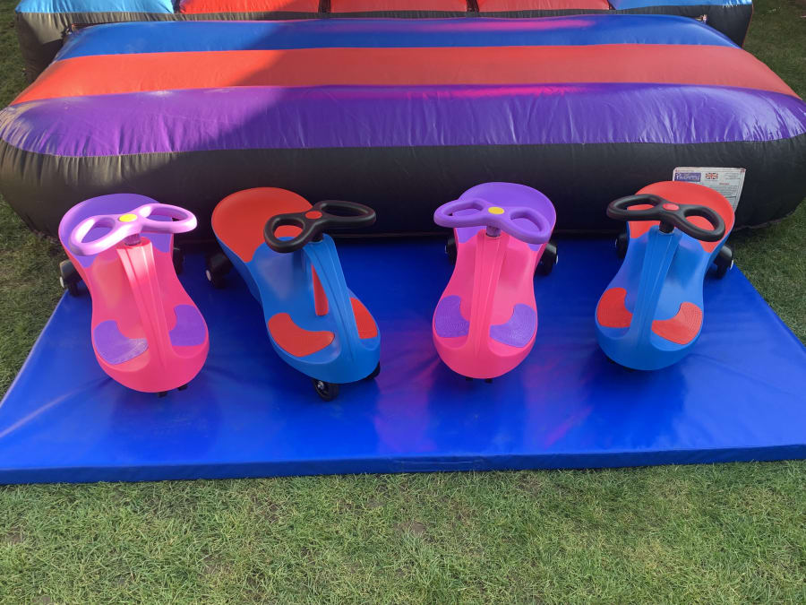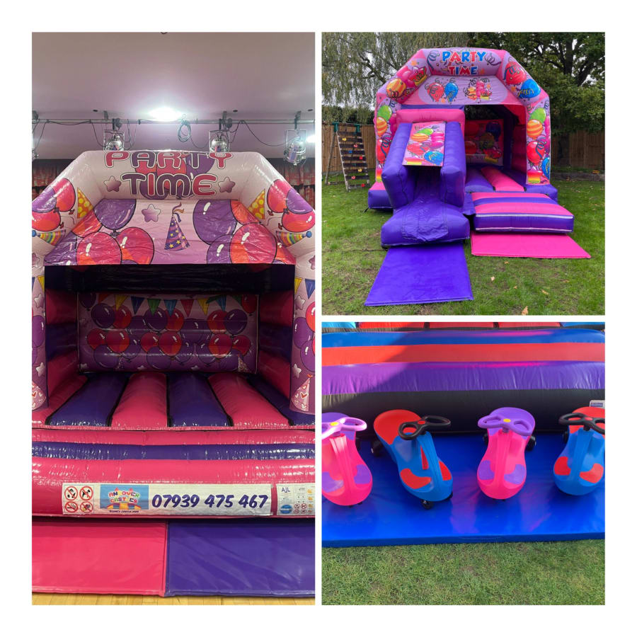 Our Pink & Purple bundle includes a pink & purple bouncy castle with your choice of a front slide or a side slide, a spacious 12x12 bouncy castle for jumping, and a set of didi cars for imaginative driving fun. Everything is cleaned and safety-checked before every hire so parents can relax and kids can play freely. 🏰🚗